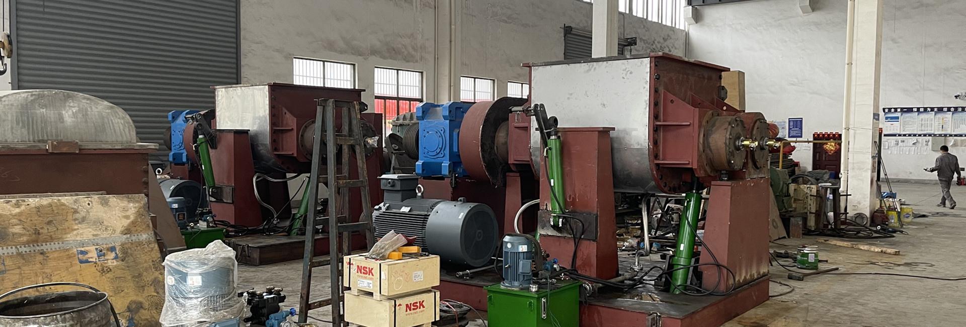 工廠擁有各類型專用生產(chǎn)設(shè)備30多臺套,具備車、刨、鏜、銑、焊等各種加工能力。大型機加工設(shè)備如CW61160L車床、T×6113C3/IV數(shù)控鏜床等等,滿足各種型號的捏合機的生產(chǎn)和加工。